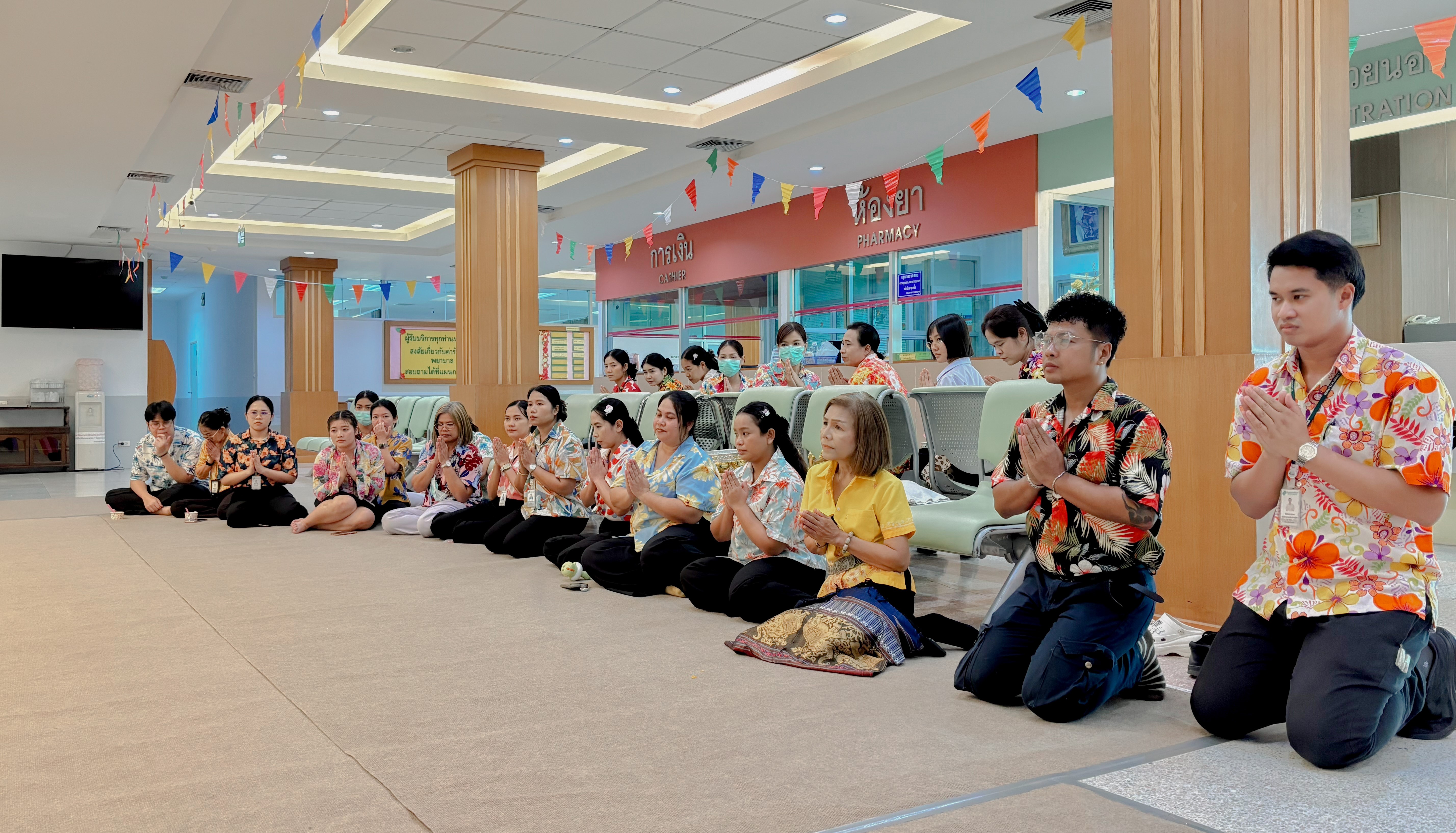 ภาพกิจกรรมทำบุญตักบาตร ข้าวสาร อาหารแห้งและสรงน้ำพระ รดน้ำดำหัวผู้ใหญ่ ณ ลานชั้น 2 บริเวณหน้าห้องยา โรงพยาบาลพีรเวช วันที่ 10 เมษายน 2569